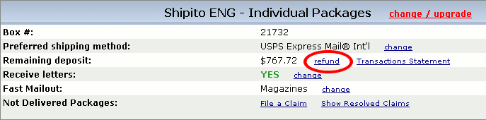 Algumas vezes você poderá adicionar fundos no Shipito e depois decidir que não vai mais fazer uso destes recursos no curto prazo, nestes casos pode ser interessante fazer um pedido de reembolso dos valores para sua conta no Paypal , é isto que este tutorial vai mostrar.1. Login em sua contaPrimeiramente, faça o login em sua conta Shipito www.shipito.com/account 2. Envie todos os pacotesVocê deve enviar todos os seus pacotes antes (ou descartados , se você não deseja enviá-los mais ). Não é possível realizar o reembolso com pacotes em sua mailbox. 3. Clique no botão “Refund” (Reembolso)Na sua conta na página principal , você pode ver seu plano atual e informações a respeito de sua conta e o valor do depósito restante .Ao lado direito do depósito restante existe um link refund(reembolso),clique nele . |