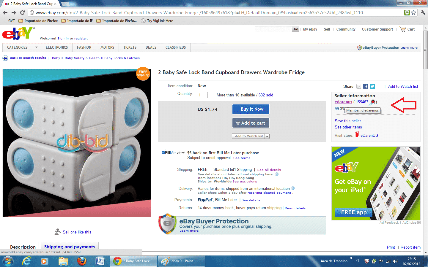Terminada a verificação das qualificações do vendedor decido em realizar a compra com ele , importante também observar que este vendedor oferece frete grátis para o Brasil .Na imagem abaixo oserve as duas setas vermelhas em uma devemos informar a quantidade de itens a serem comprados e na outra no buy it now inicia o processo de compra , depois de preencher quantos itens deseja conprar clique no Buy it now , o processo de compra no Ebay pode parecer a primeira vista complicado mas depois deste tutorial você terá segurança para fazer qualquer compra dentro do Ebay escolhendo vendedores bem qualificados .