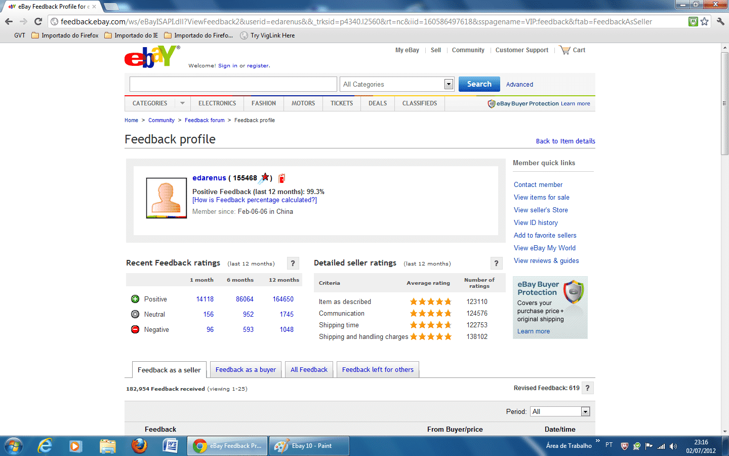 Abaixo temos as telas das classificações dadas por compradores a este vendedor