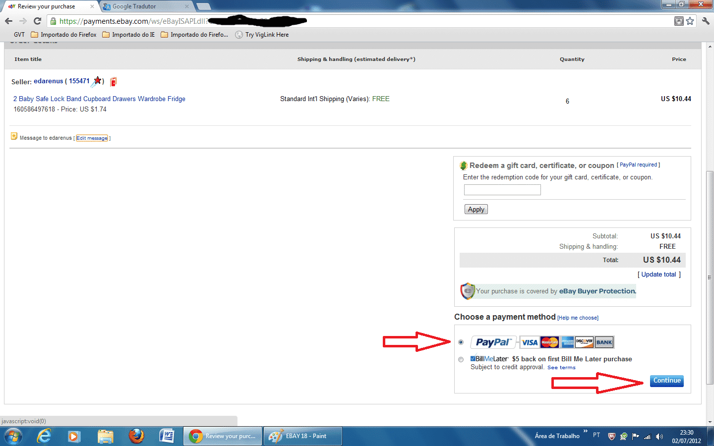 Clique onde as setas vermelhas apontam, em Paypal e depois em continue